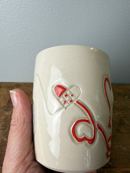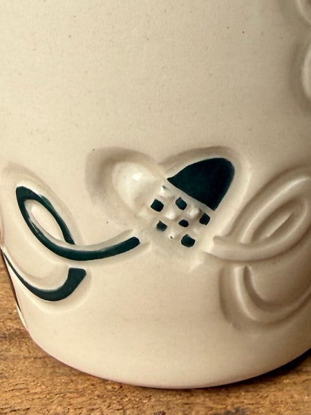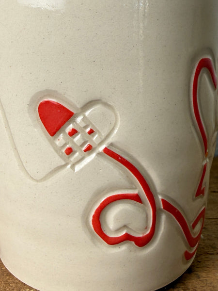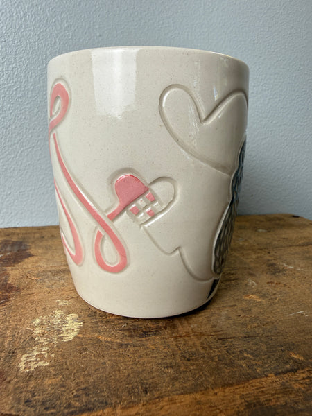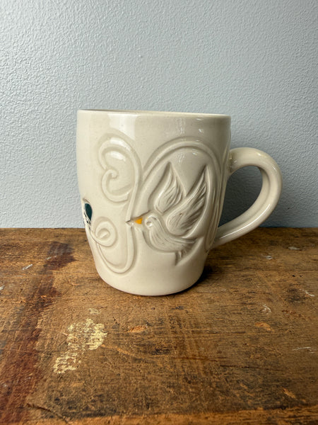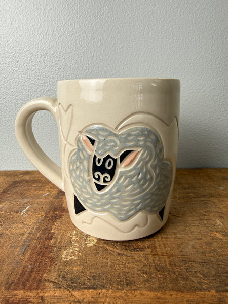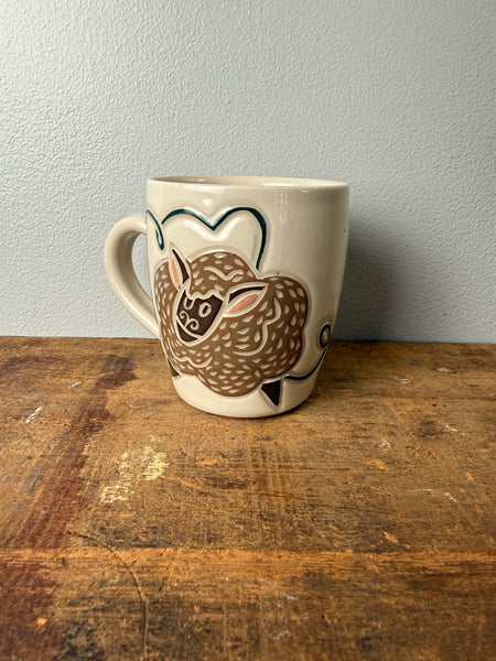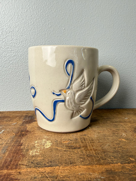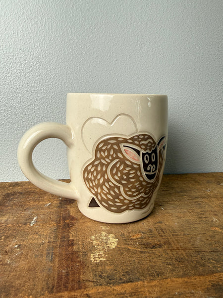 The 2025 Rhinebeck mug has arrived with hope. This year's design features a peace dove, heart and sheepy. Choose your color heart and string when purchasing. Sheep colors will be grey, brown or black- potter's choice.